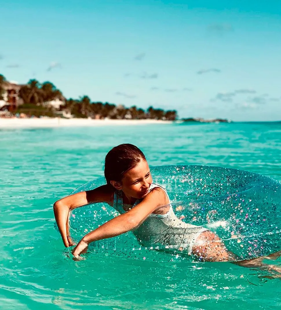 SunnyLife baderingen pustes op med en praktisk ventil, der kan trykkes ind i baderingen, så den ikke kommer til at genere legen i vandet.