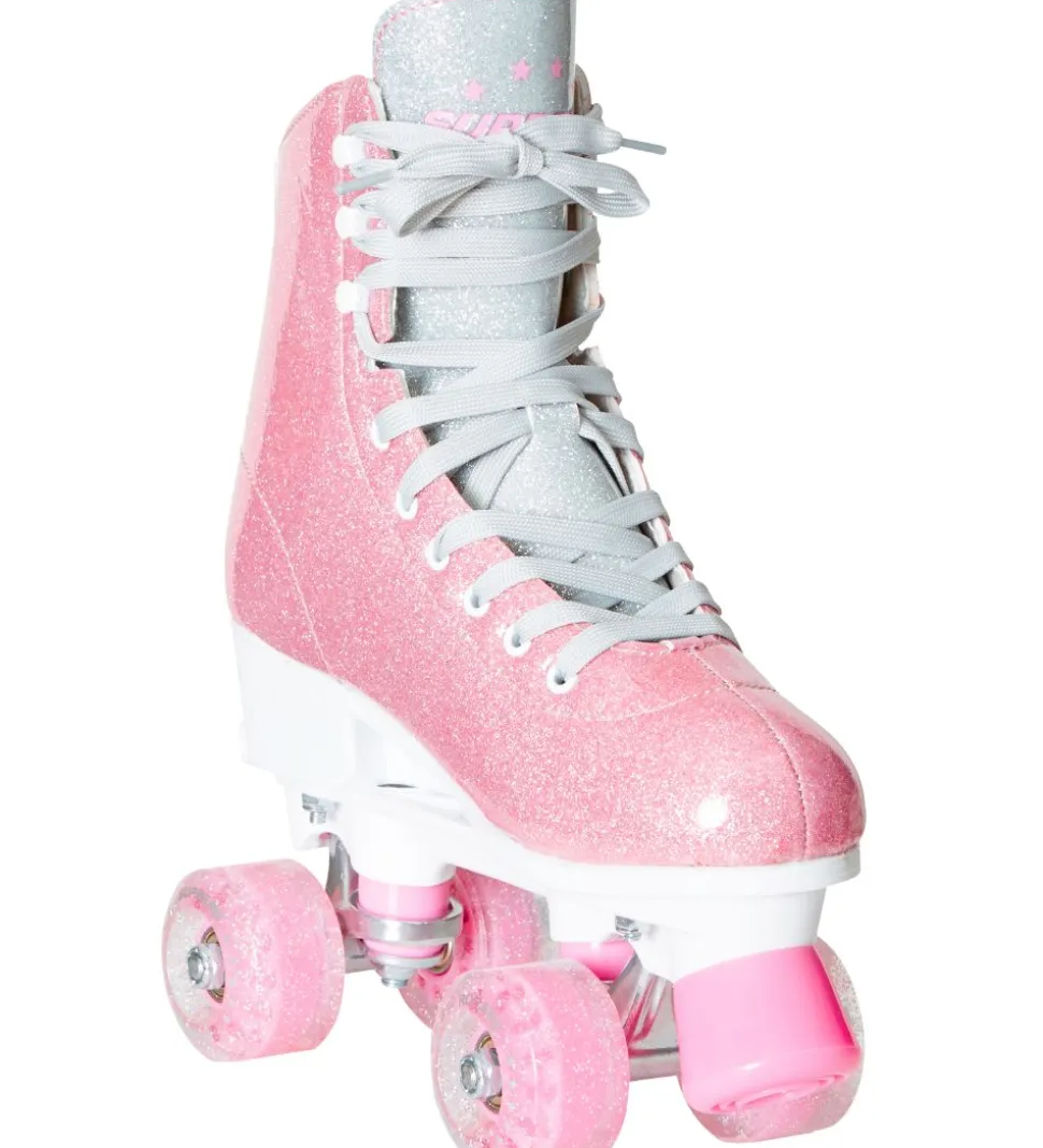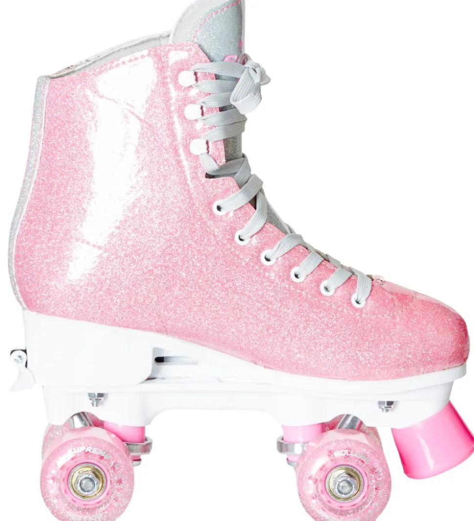 Fine Supreme rulleskøjter i rosa og sølv med glimmer og hvide snørebånd. Rulleskøjterne har transperante hjul med sølvglimmer og et rosa skær.