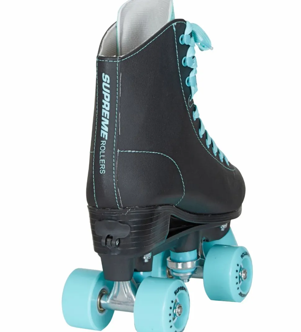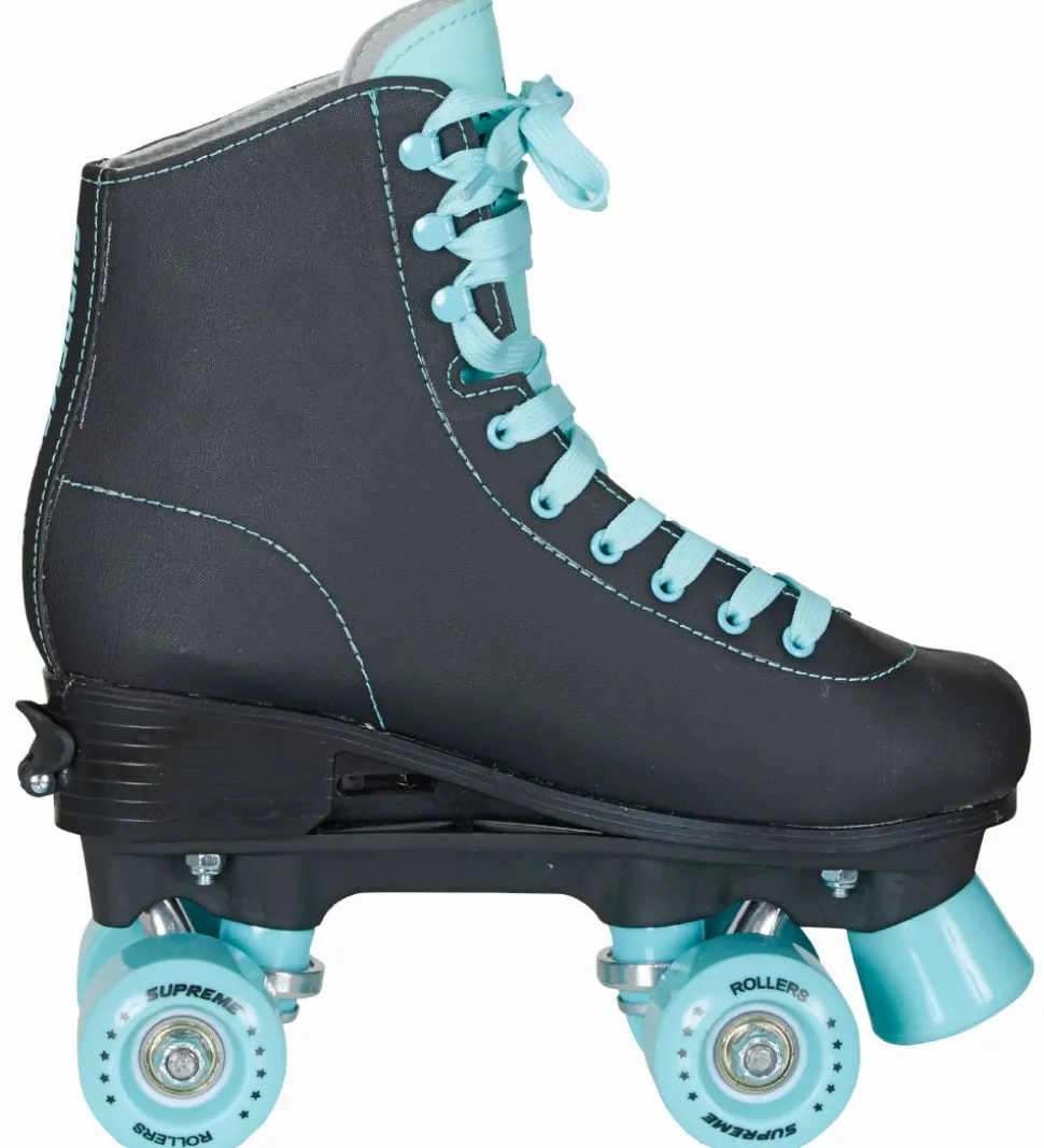 Seje Supreme rulleskøjter i sort med turkisblå snørebånd og hjul.
