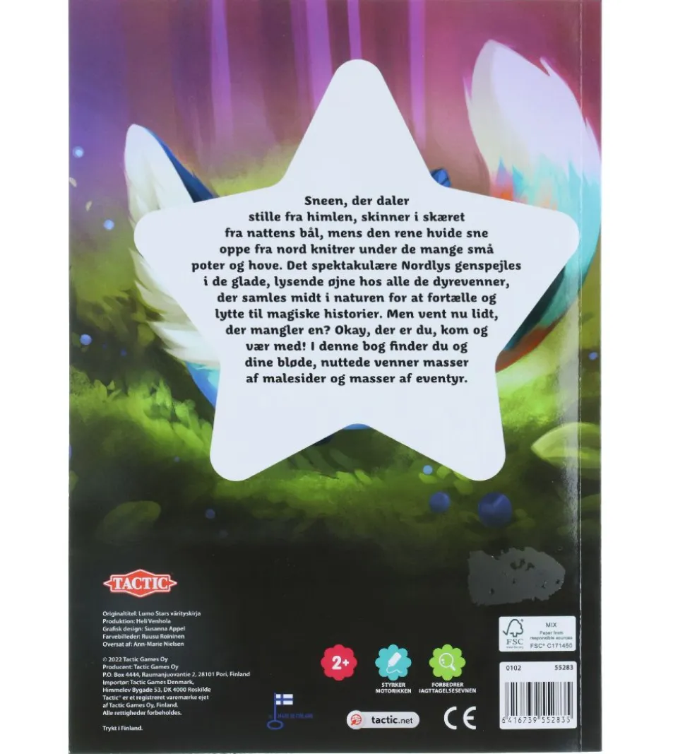 Malebogen har et stort motiv af et dyr på hver anden side, og på de andre sider er der små ansigter af dyrene og forskellige motiver, som f.eks. stjerner, snefnug eller lignende.