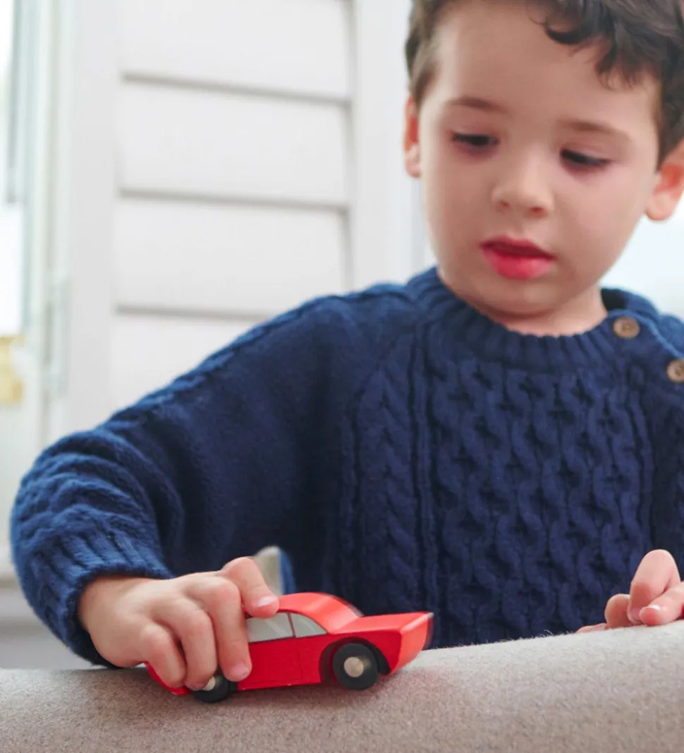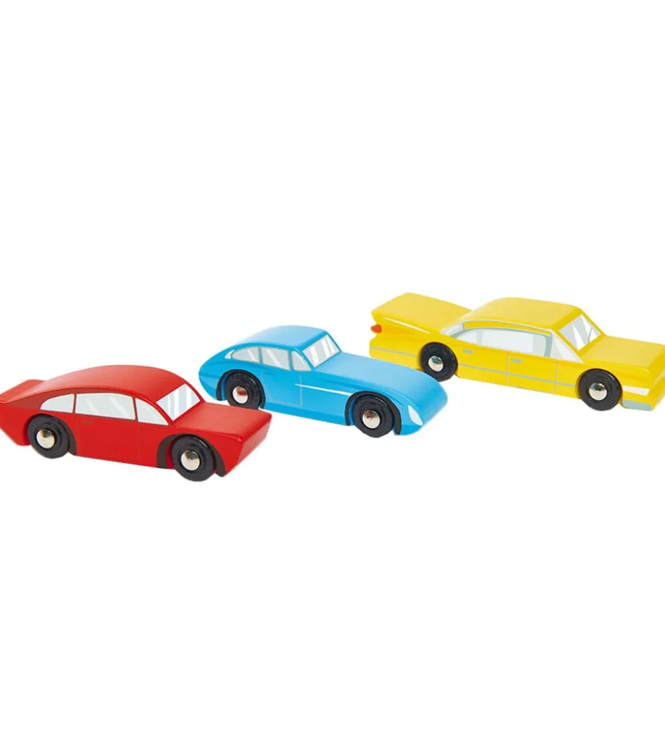 Fint Tender Leaf trælegetøj i naturlig træ og fine farver, som er formet som tre forskellige biler i følgende farver: