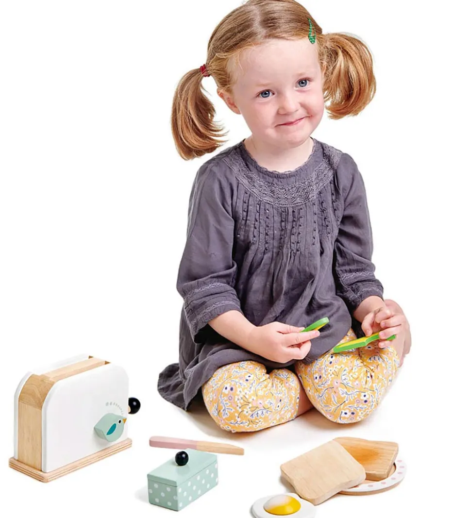 Fint Tender Leaf trælegetøj i naturlig træ og fine farver, som er formet som en brødrister med følgende ting: