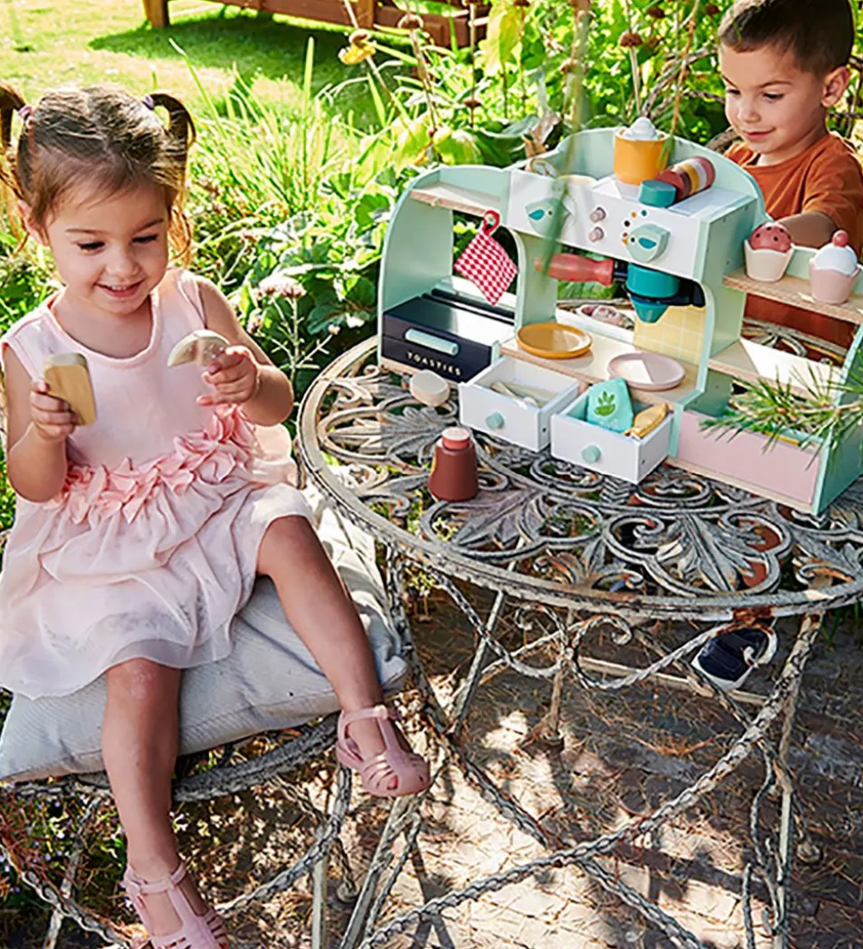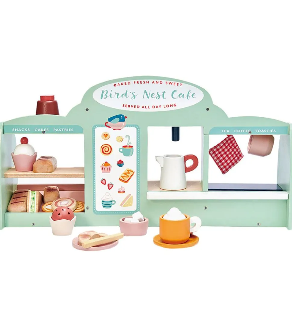 Sjovt Tender Leaf trælegetøj i naturlig træ og fine farver, som er formet som et cafe-sæt med følgende ting: