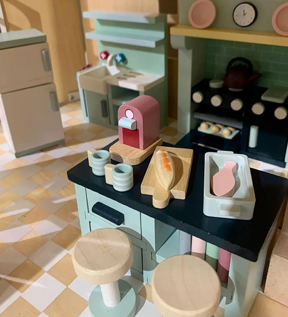 Fint Tender Leaf trælegetøj i naturlig træ og fine farver, som er formet som forskellige møbler til køkkenet med følgende ting: