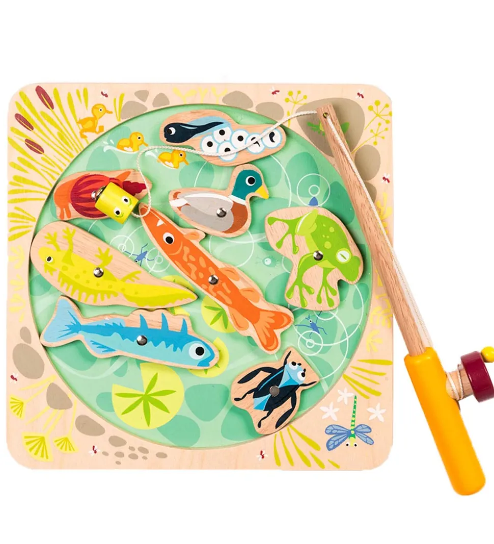 Tender Leaf trælegetøjet har praktisk magnet, så barnet kan fiske de forskellige dyr ud af vandet med den medfølgende fiskestang. Spillet byder på mange timers underholdende leg.