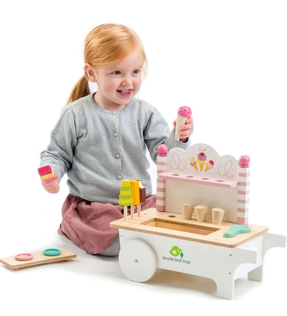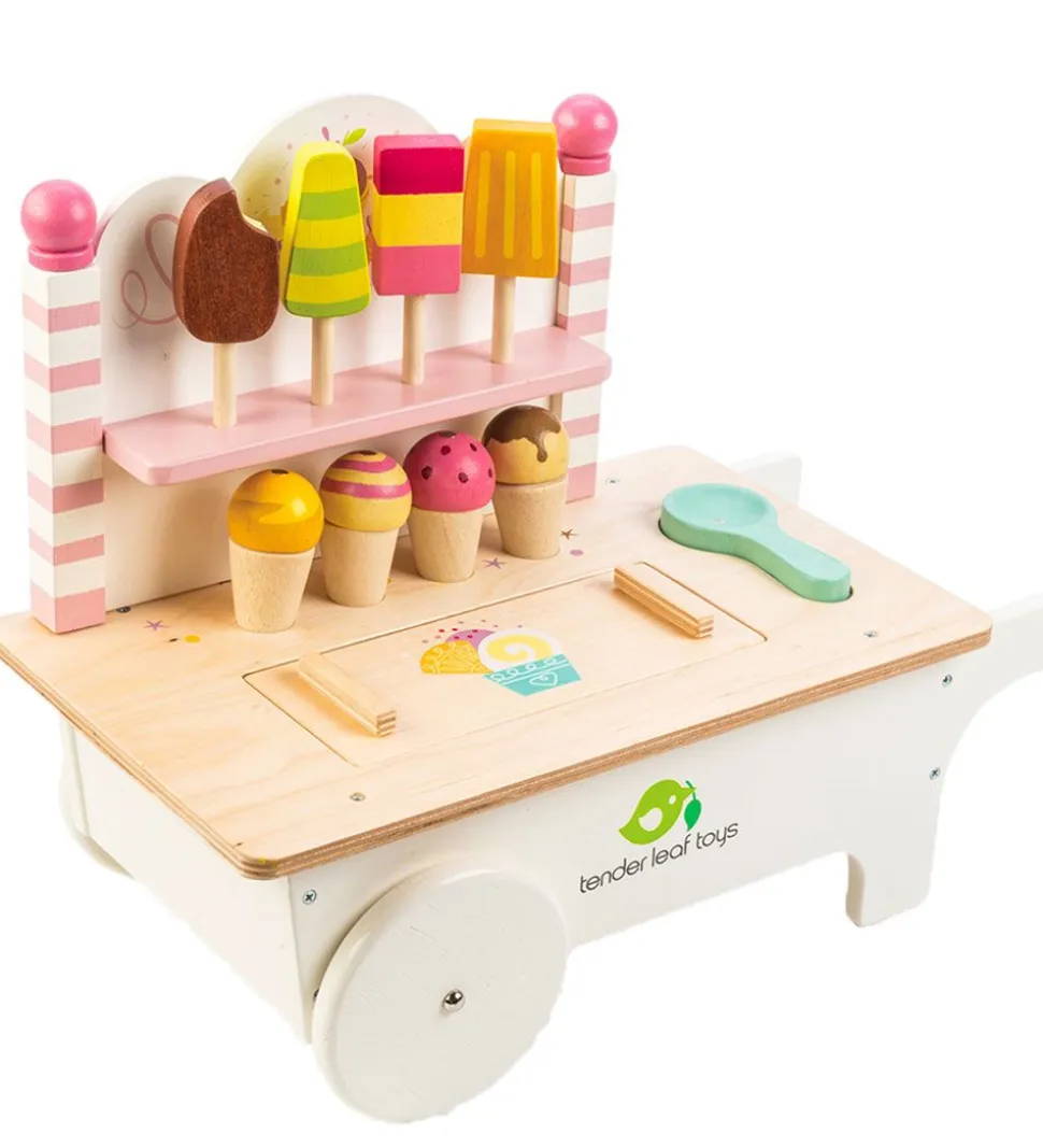 Sjovt Tender Leaf trælegetøj i naturlig træ og fine farver, som er formet som en isvogn med følgende ting: