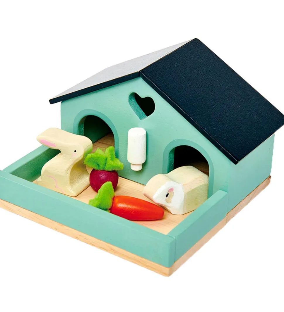 Sjovt Tender Leaf trælegetøj i naturlig træ og fine farver, som er formet som et kæledyrssæt som består af følgende ting: