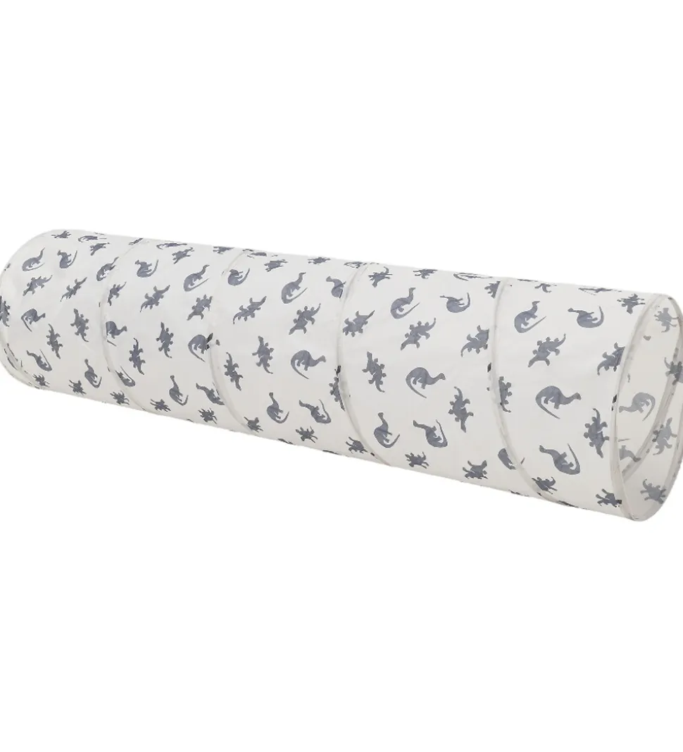 Sjov That’s Mine legetunnel i hvid med et alloverdinosaurprint i blå nuancer.