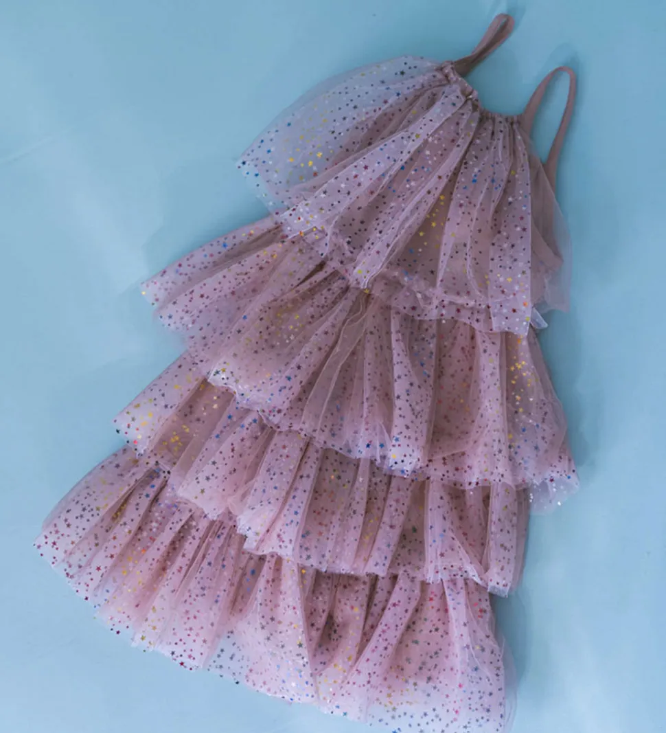 Sjov That’s Mine udklædning i form af denne smukke Elena fe-kjole i rosa tyl fyldt med skinnende stjerner i alverdens farver.