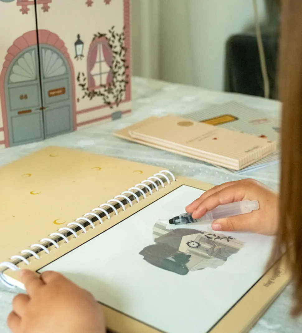 Vandmalebogen har spiralryg og kraftige sider der skal males med den medfølgende, smarte tusch, som fyldes med vand. Når vandet fra pennen rammer illustrationerne, toner farverne frem.