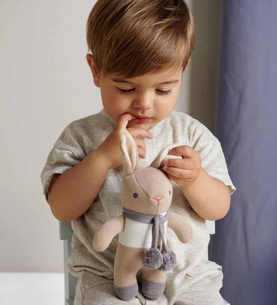 Skøn ThreadBear rangle med form som en brun kanin med et gråt pompon-halstørklæde og broderede detaljer.