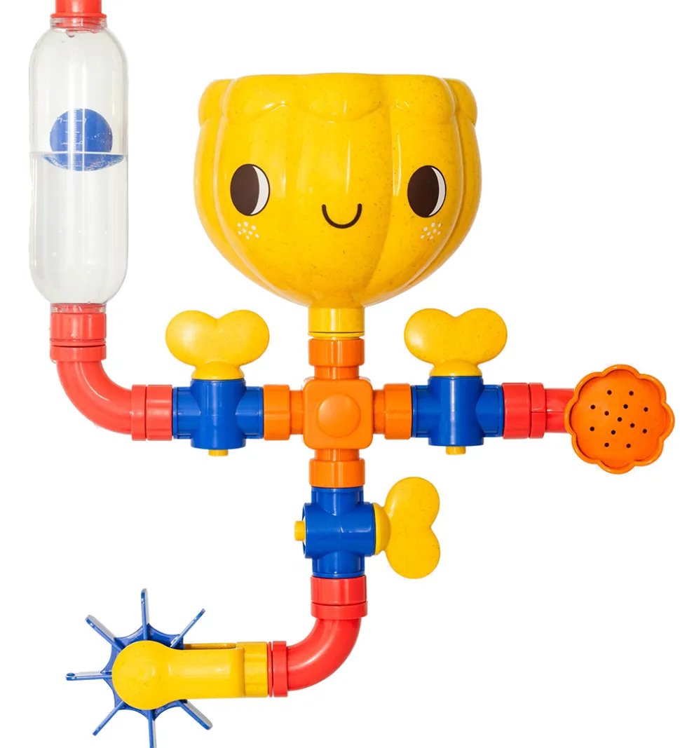 Med dette badelegetøjssæt kan man udforske vandets sjove egenskaber ved at lukke og åbne for ventilerne, se møllen dreje rundt med vandkraft, eksperimentere med den blå flydende bold og se vandet blive skudt ud af vandkande-mundstykket.