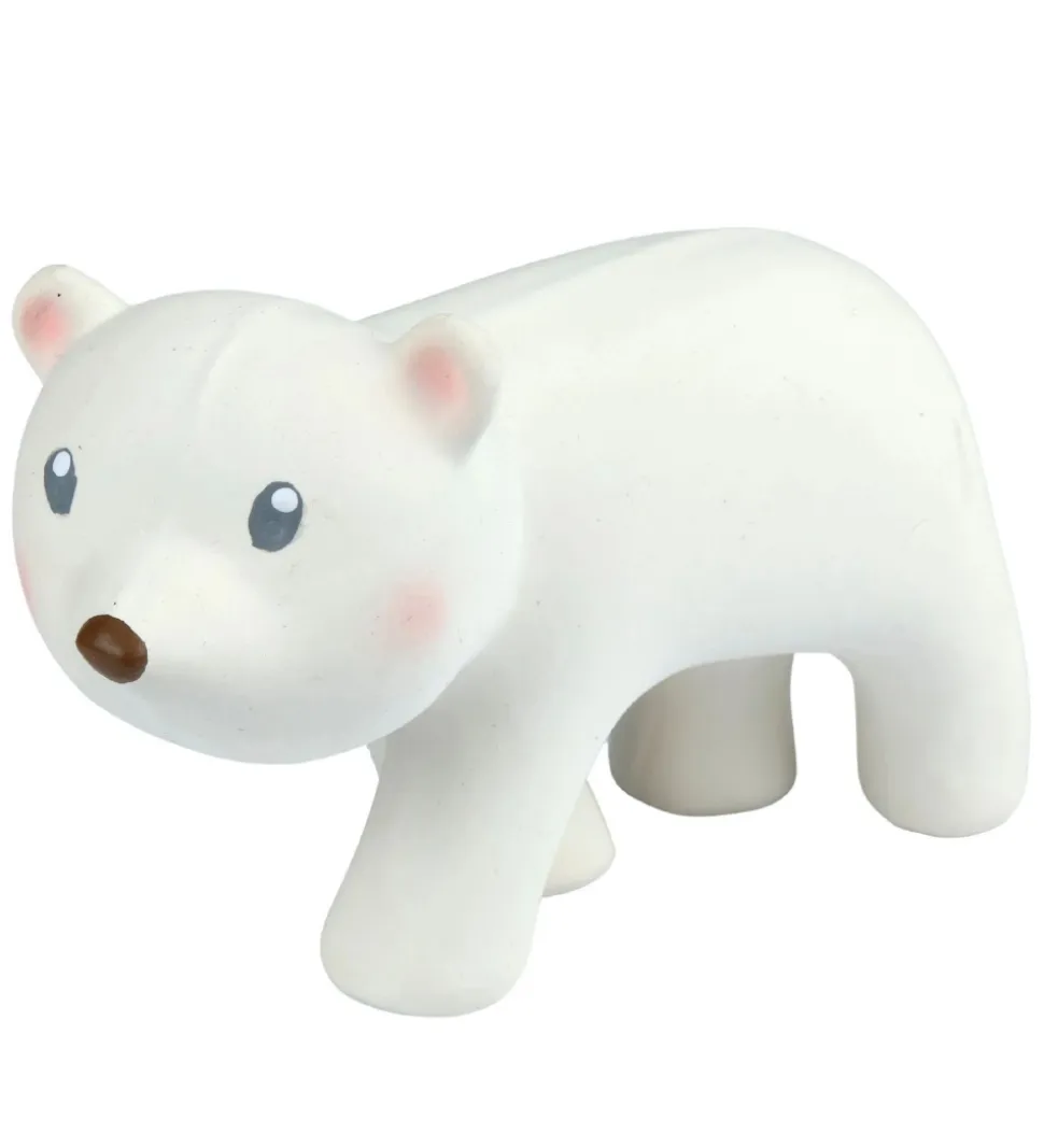 Tikiri bidelegetøjet kan tages med i badet, så barnet har en god kammerat med, som altid er klar på lidt spas i vandet. Isbjørnen er i naturgummi og er derfor også perfekt til at lindre de smås gummer, når de klør. Bidedyret har en rangle, som laver beroligende lyde når man ryster det og der er forskellige teksturer. Isbjørnen behøver altså ikke kun at være med i badet.