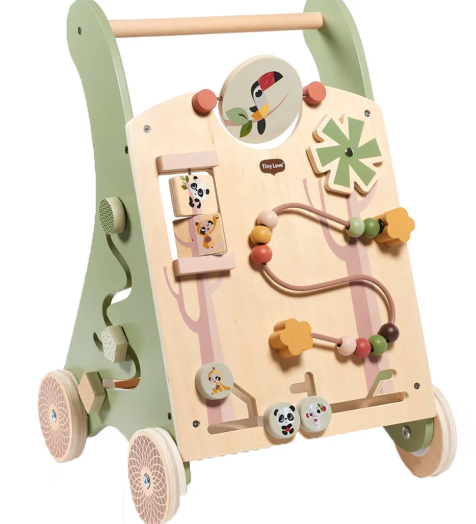 Tiny Love gåvognen har afrundede hjørner og et fint træhåndtag, som barnet kan holde ved. Gåvognen er også et legetøj, da den inderholder hele 15 forskellige aktiviteter såsom drejelige tandhjul, kugler på snoet metalwire, en labyrint, og drehelige dele.