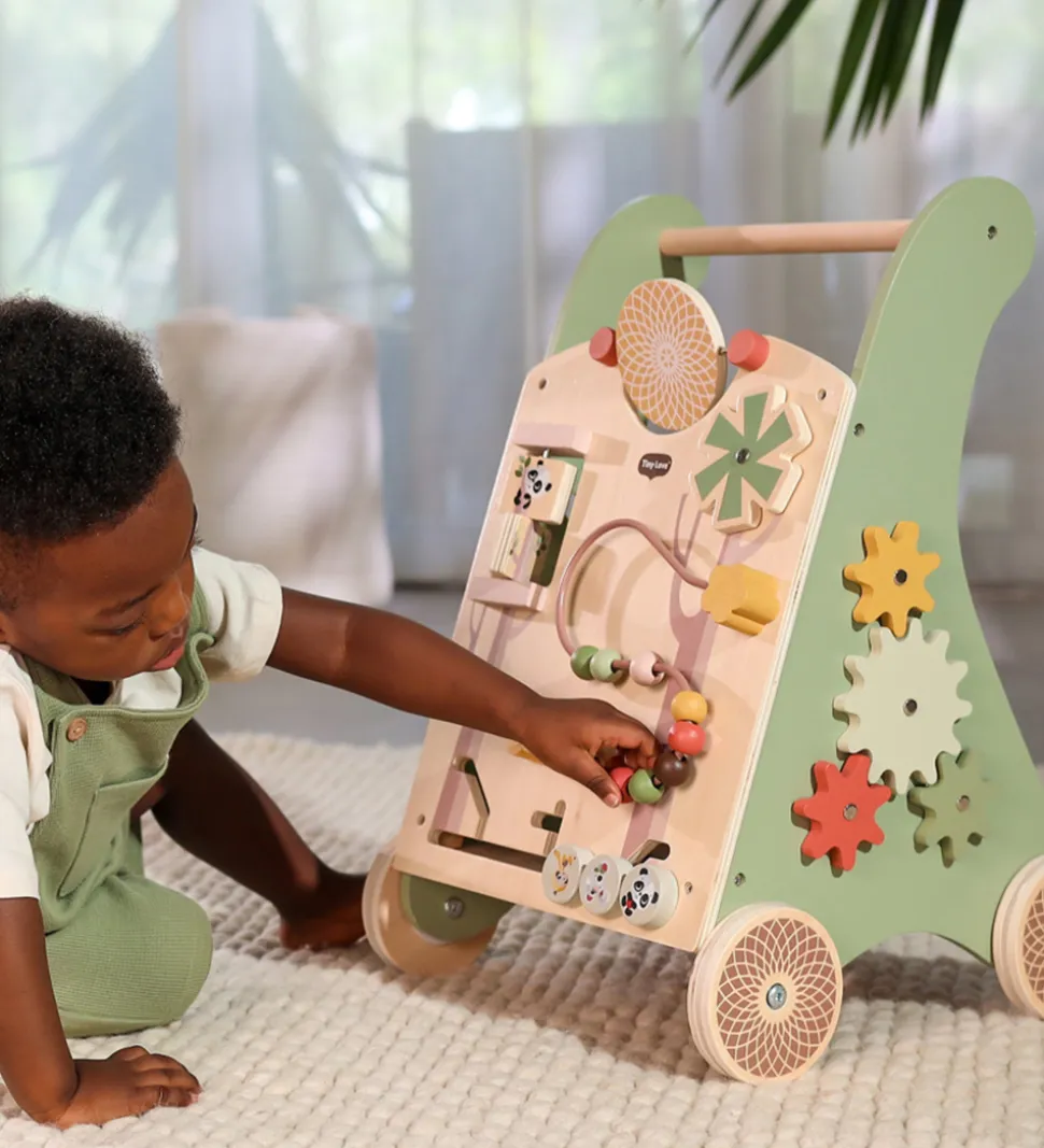 Flot Tiny Love gåvogn i naturligfarvet træ og mintgrøn. Gåvognen har en aktivitetsplade med aktiviteter i forskellige farver.