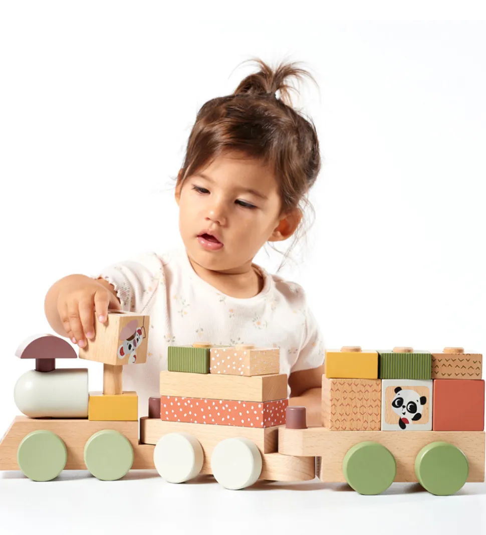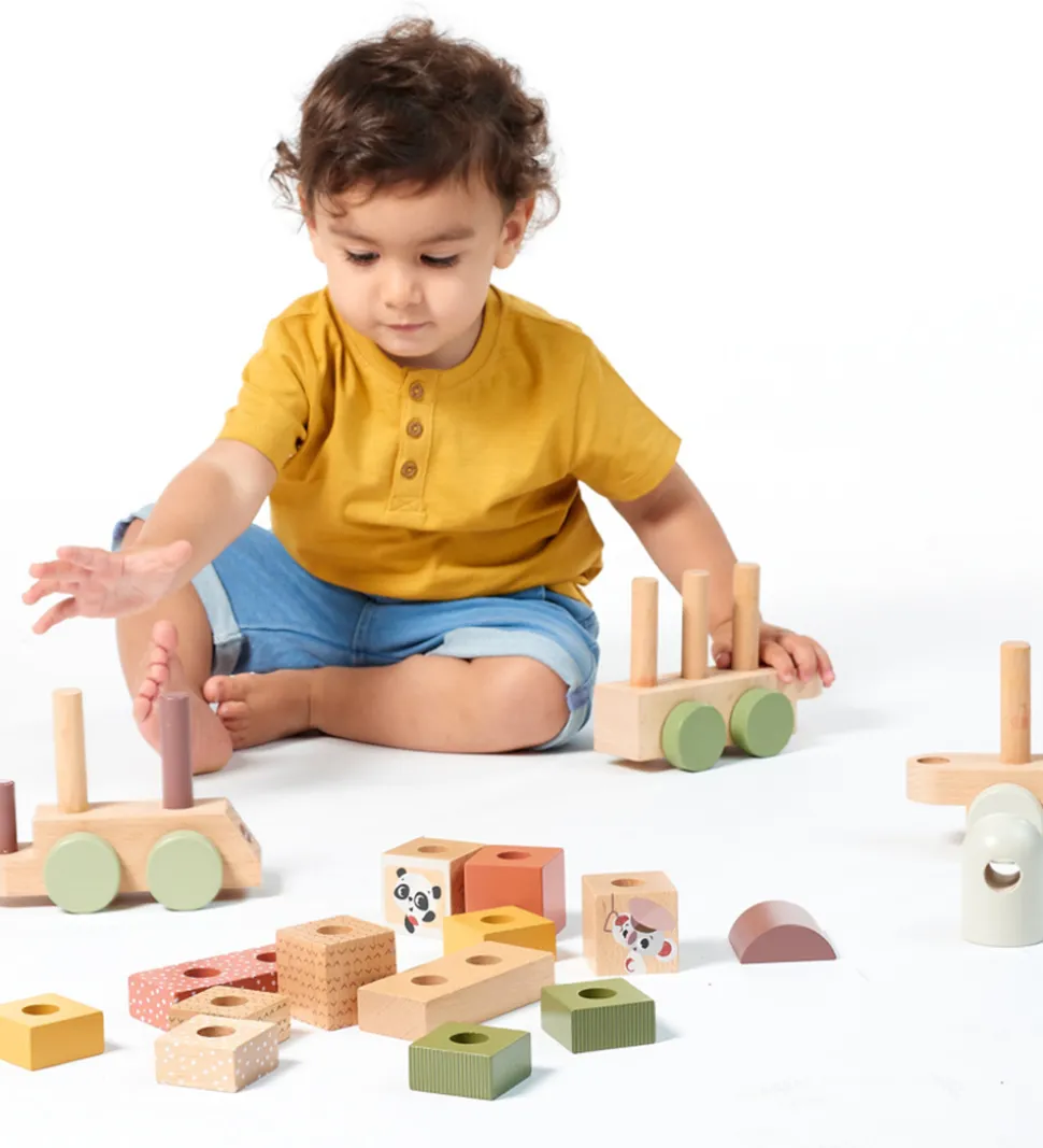 Leg med stabletoget udvikler barnets finmotorik, form- og farveforståelse samt logiske sans.