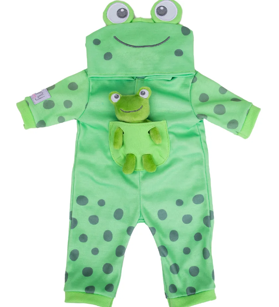 Smart Tiny Treasures dukketøj bestående af en grøn heldragt med prikker i en mørkere grøn nuance. Heldragten har en hætte med øjne og mund som en frø. Der medfølger en lille frø-bamse, som kan sidde på maven af heldragten, hvor der er en kænugulomme med huller til frøens ben og arme.