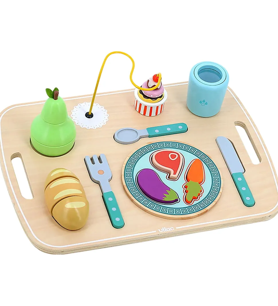 Sjovt Vilac aktivitetslegetøj i malet træ formet som en bakke med et spisesæt og mad. Alle delene kan tages op af bakken og gaflen er magnetisk, så den kan opsamle maden. Aktivitetslegetøjet kan stables, sættes sammen og skills ad og meget mere.