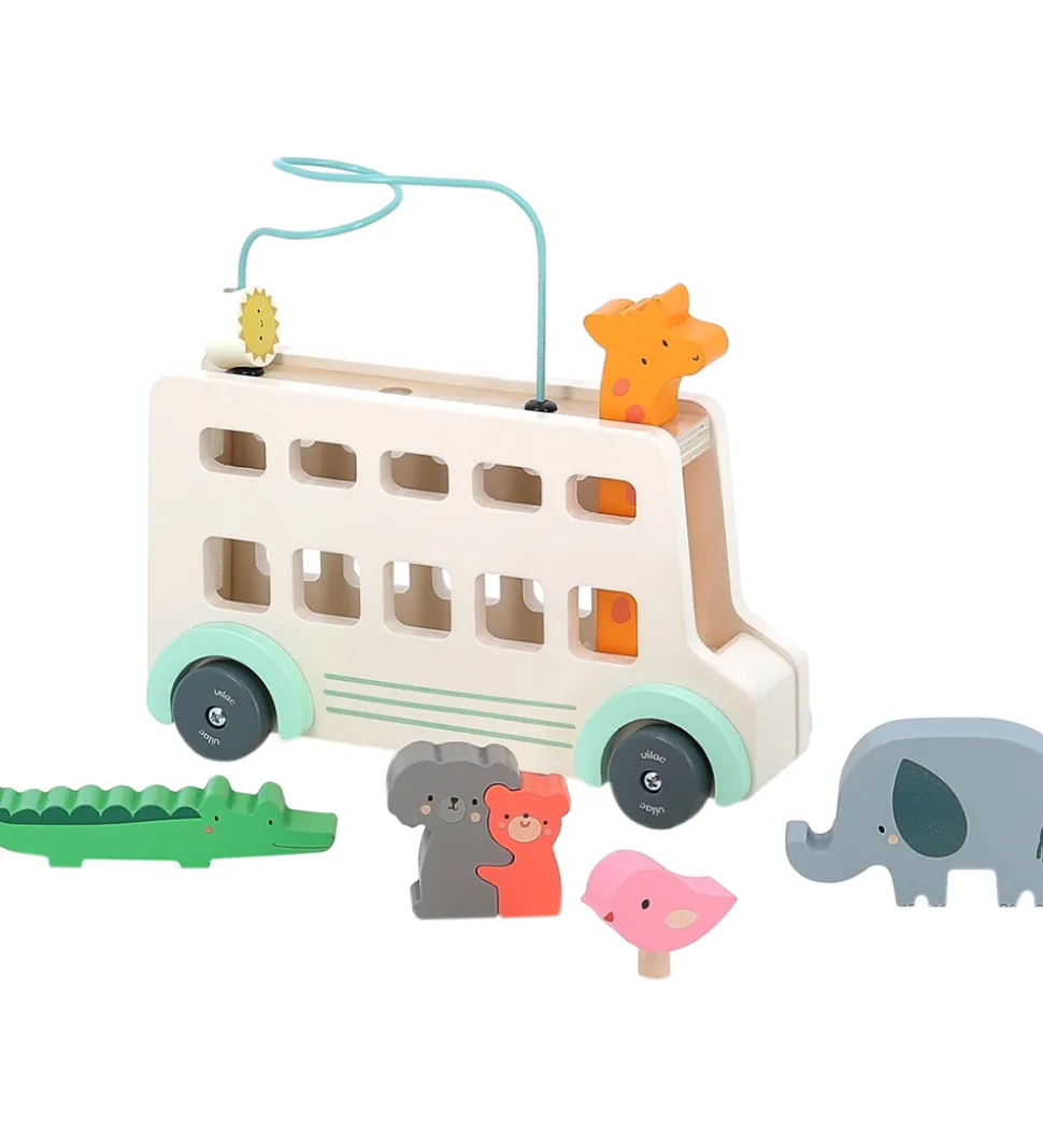 Sødt Vilac aktivitetslegetøj i form af en bus med forskellige dyr i afdæmpede farver.