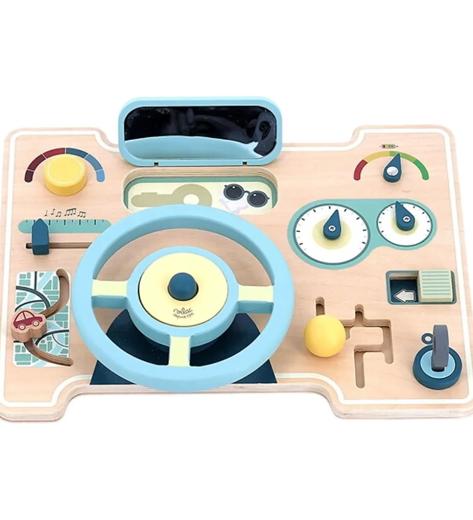 Sjovt Vilac aktivitetslegetøj i malet træ formet som et instrumentbræt med et rat og en masse knapper som kan skubbes og drejes. Vilac aktivitetslegetøjet har 11 forskellige aktiviteter, som kan underholde i timevis.