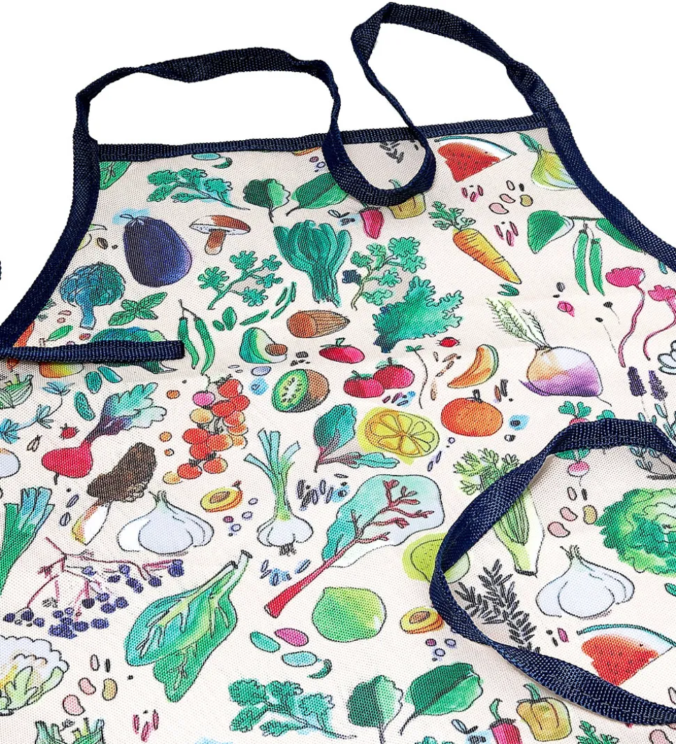- 1 forklæde i hvid med et print af forskellige grønsager i flotte farver