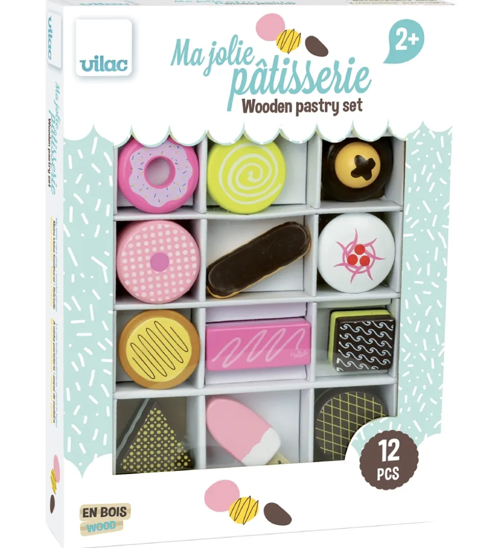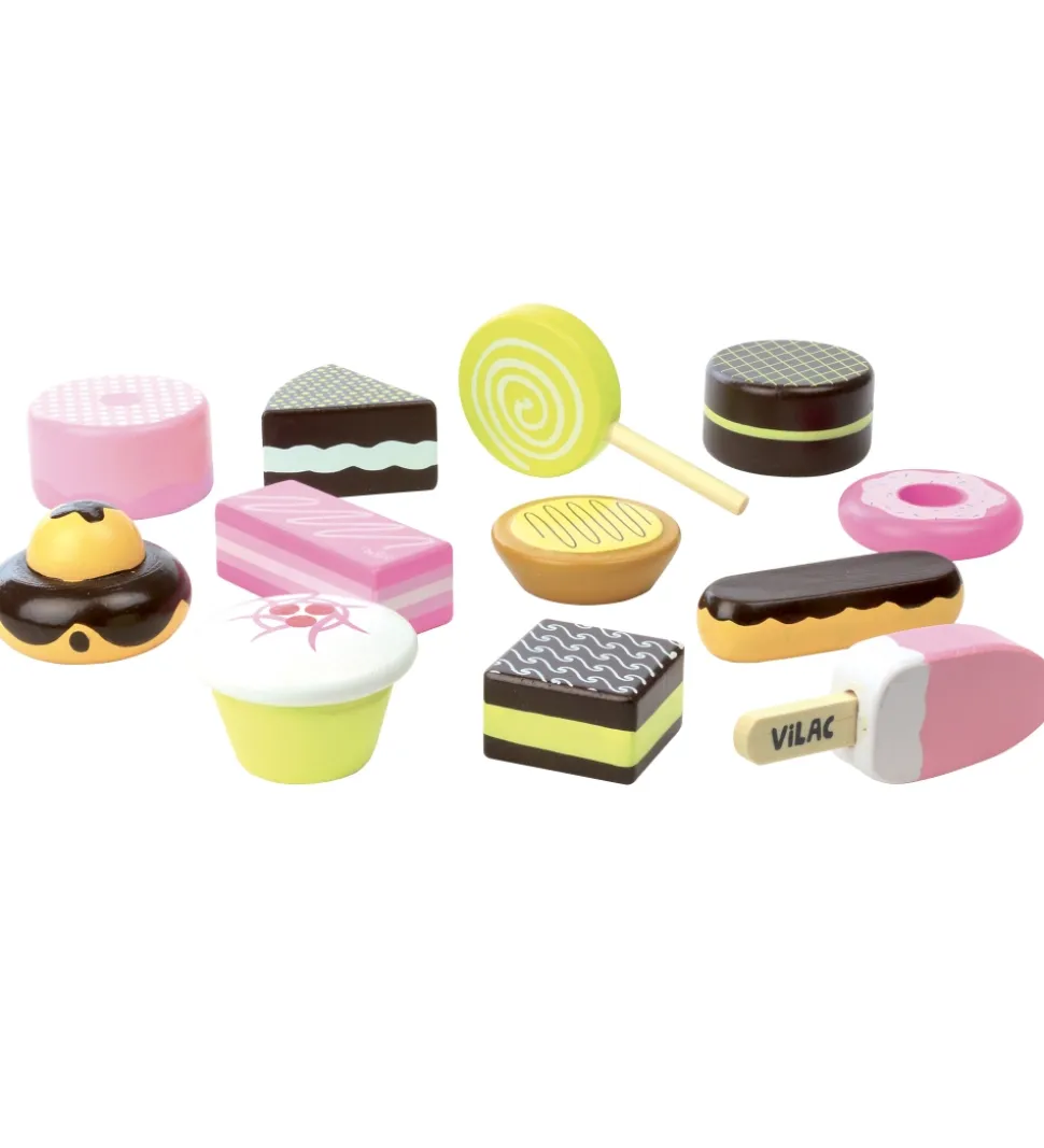 Underholdende Vilac legemad bestående af et kagesæt, med 12 forskellige kager som er lavet af træ og er i skønne farver.