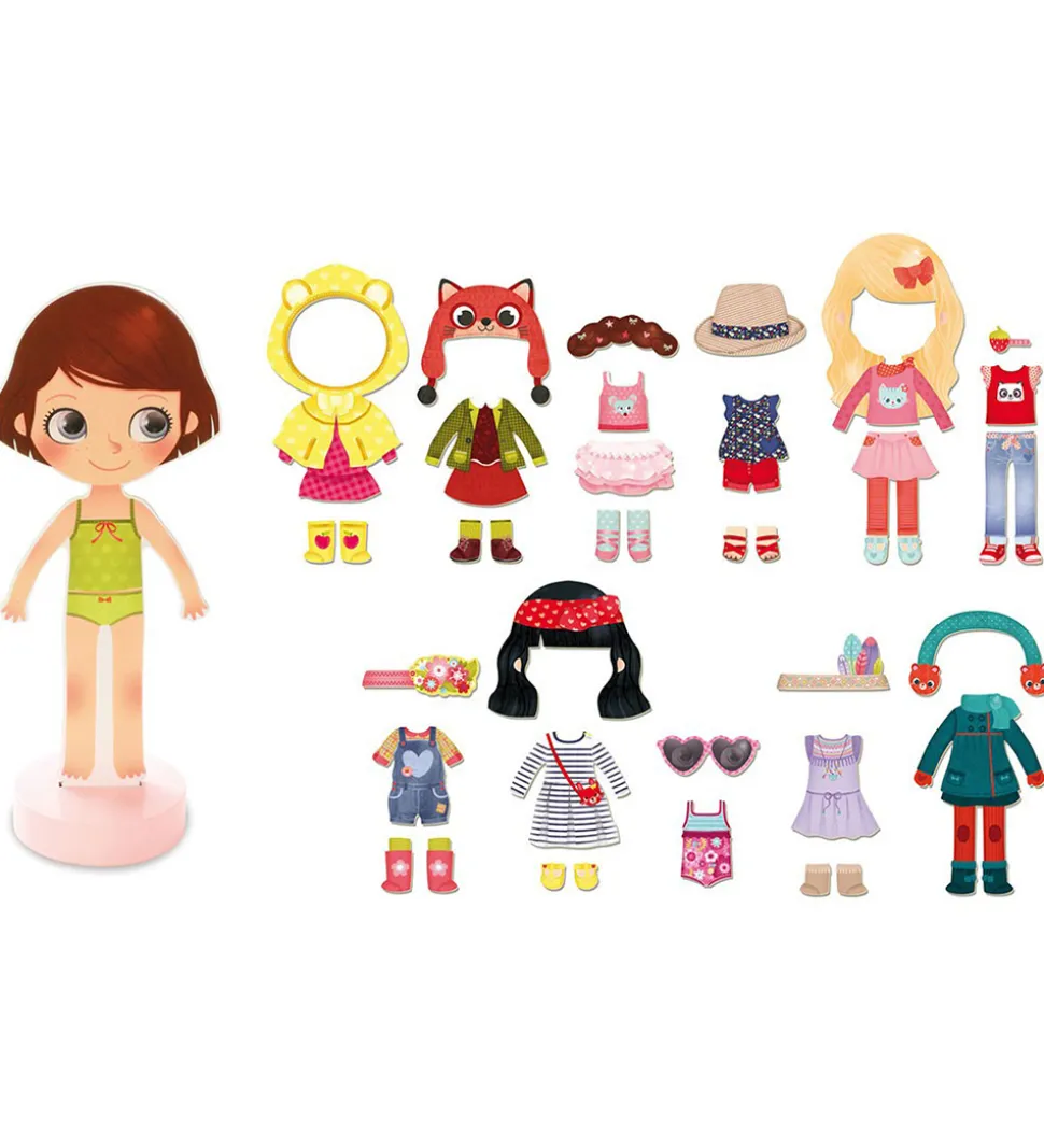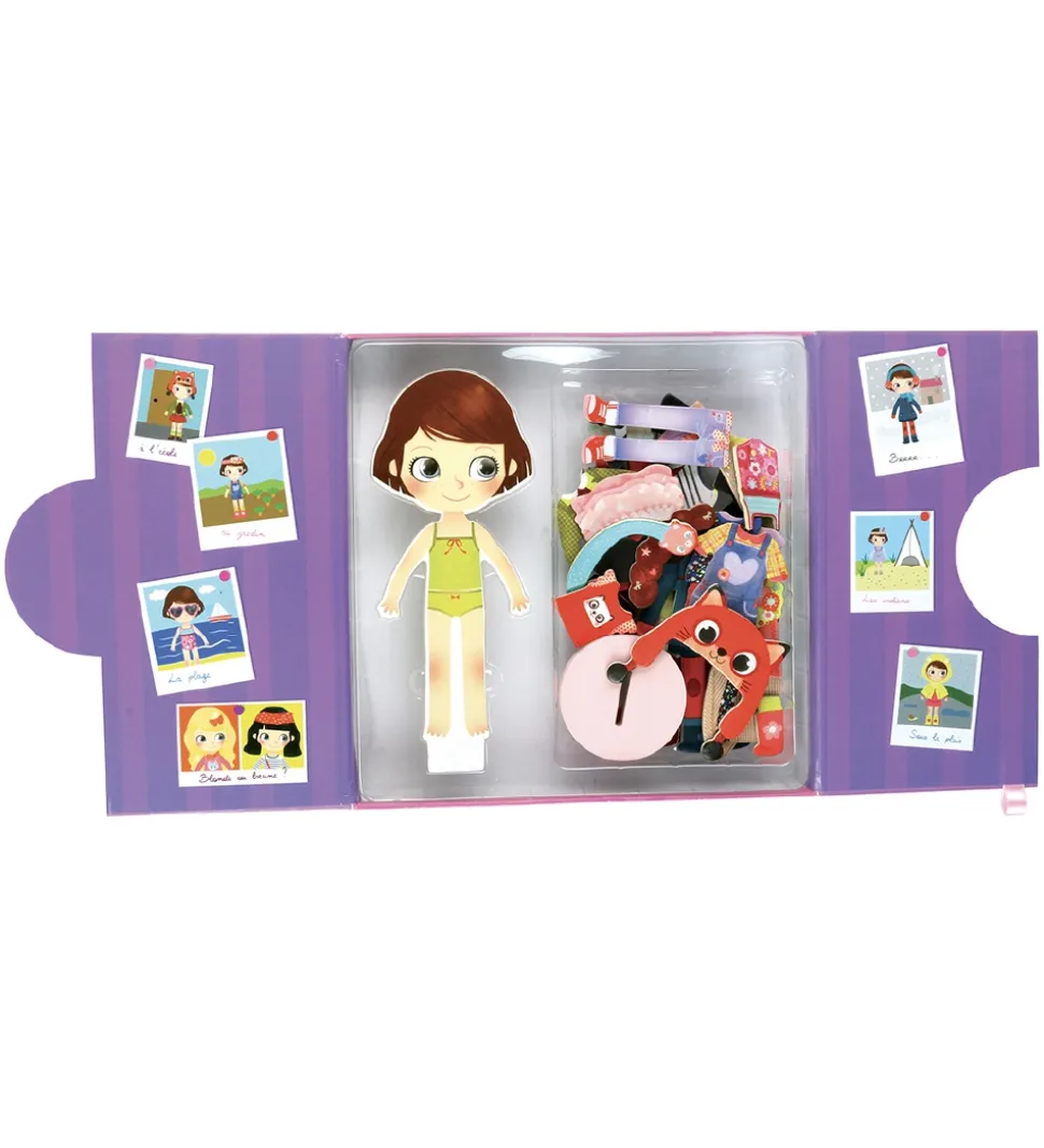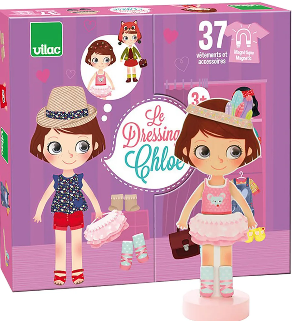 Vilac sættet kommer i en kasse og indeholder pige og 37 forskellige tilbehører. De er magnetiske, så tilbehøret nemt kan fastsættes på pigen. Vilac træ-påklædningsdukken er meget underholdende og inviterer til mange timers leg.