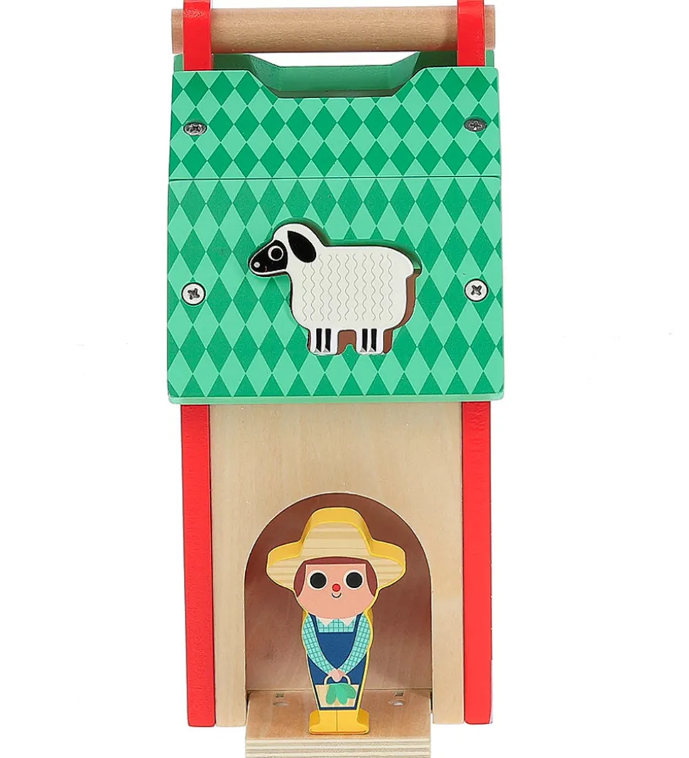 Fin Vilac puttekasse, der forestiller en hyggelig, rød bondegård og grønt tag.