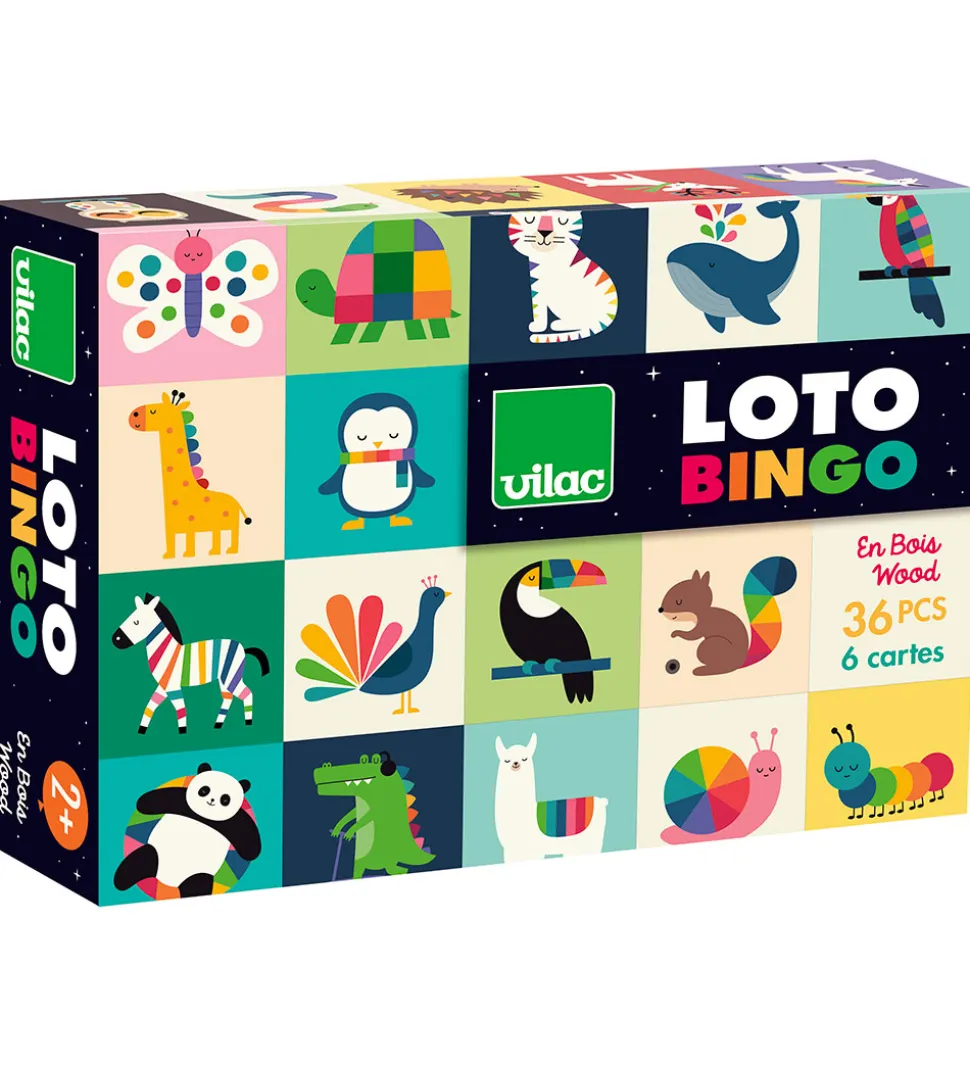 Sjove Vilac bingo lavet i træ med forskellige søde dyr med fine farver og mønstre.