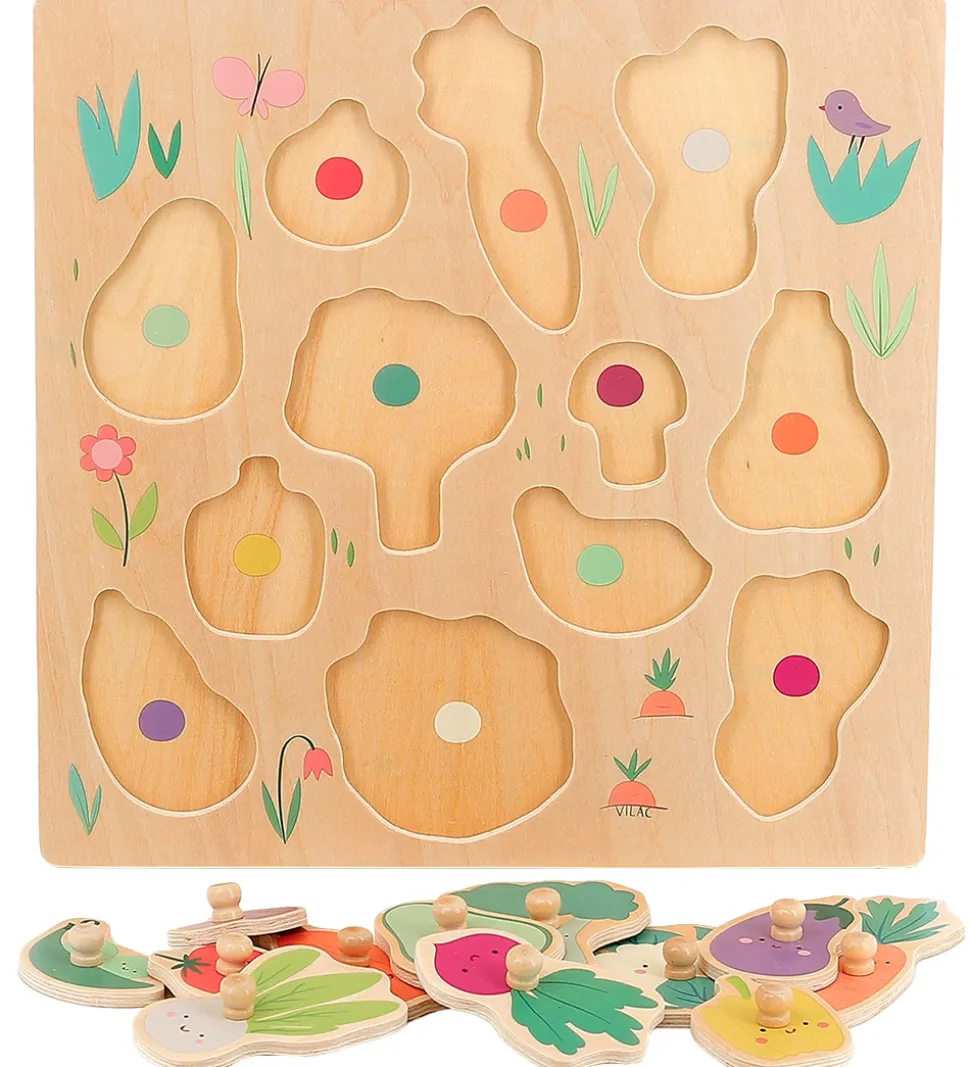Sjovt Vilac puslespil lavet i træ med forskellige søde grønsager med fine farver.