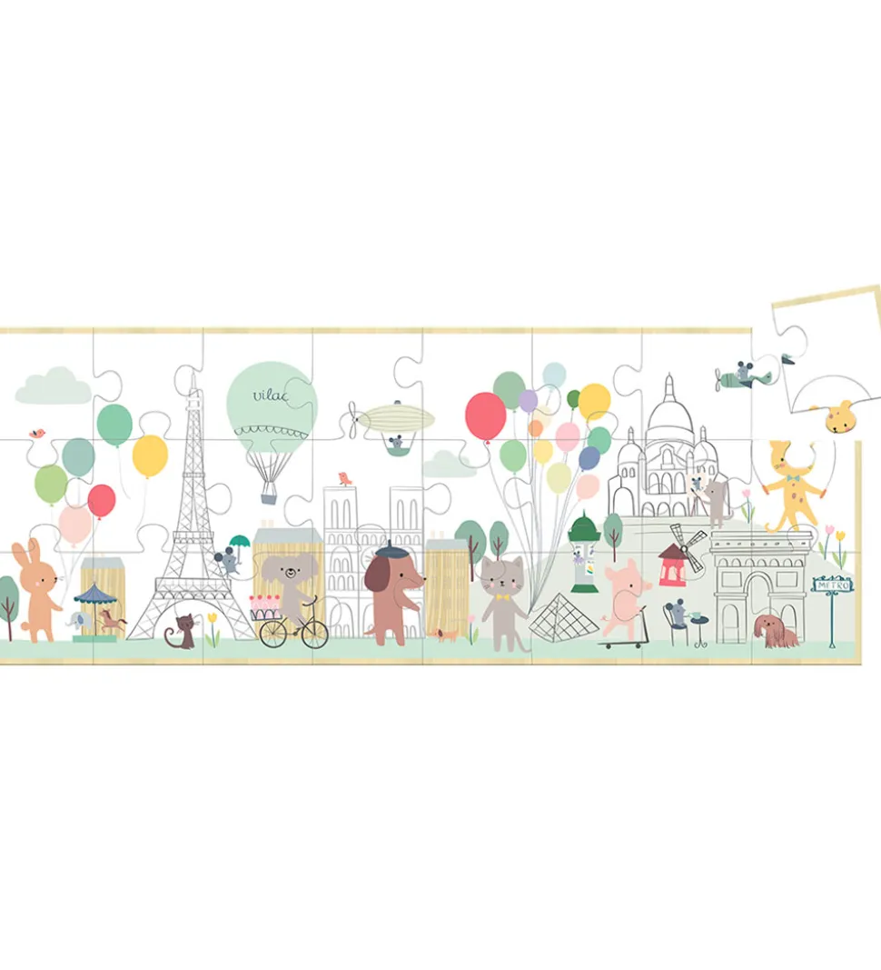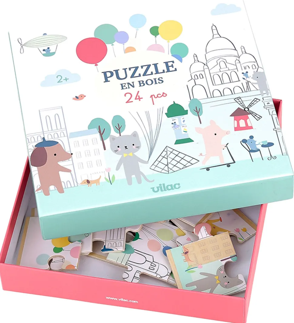 Sjovt Vilac puslespil med en firkantet form med 24 brikker med et motiv af paris med søde dyr.
