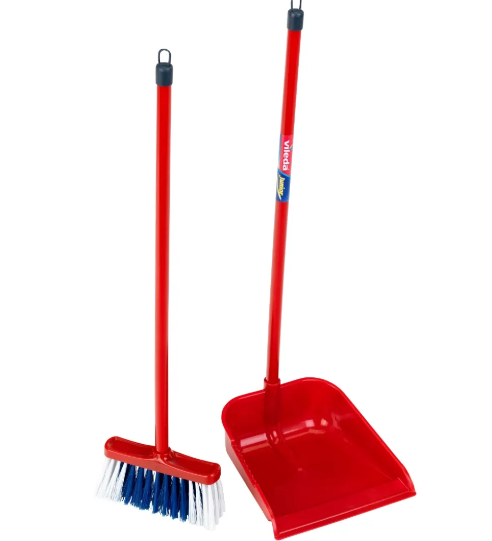 Vileda Junior fejebakken har et langt skaft, så man ikke skal bøje sig ned for at bruge den. Kosten har bløde hår og sættet er perfekt til de små, som gerne vil være en del af den spændende dagligdag.