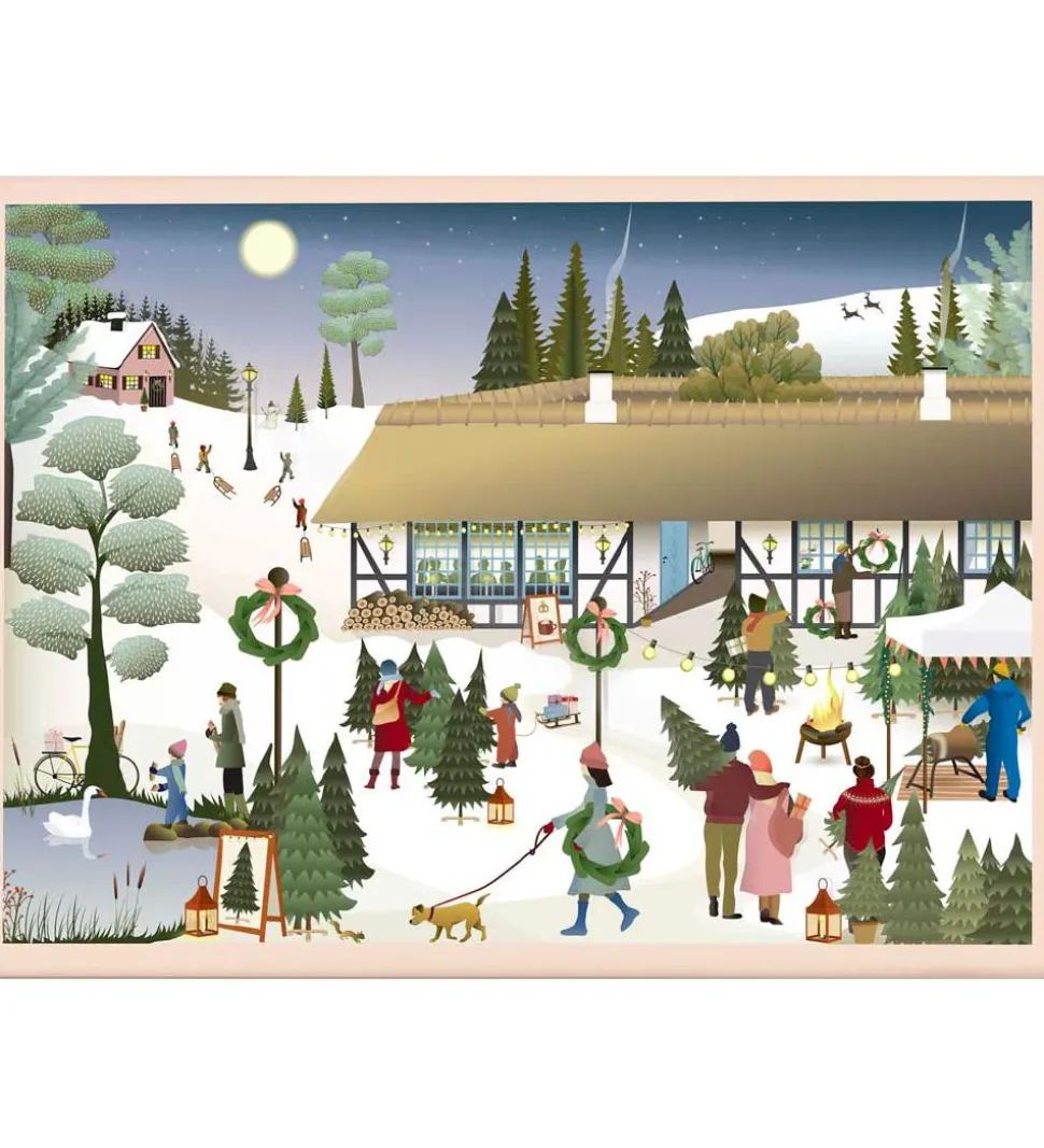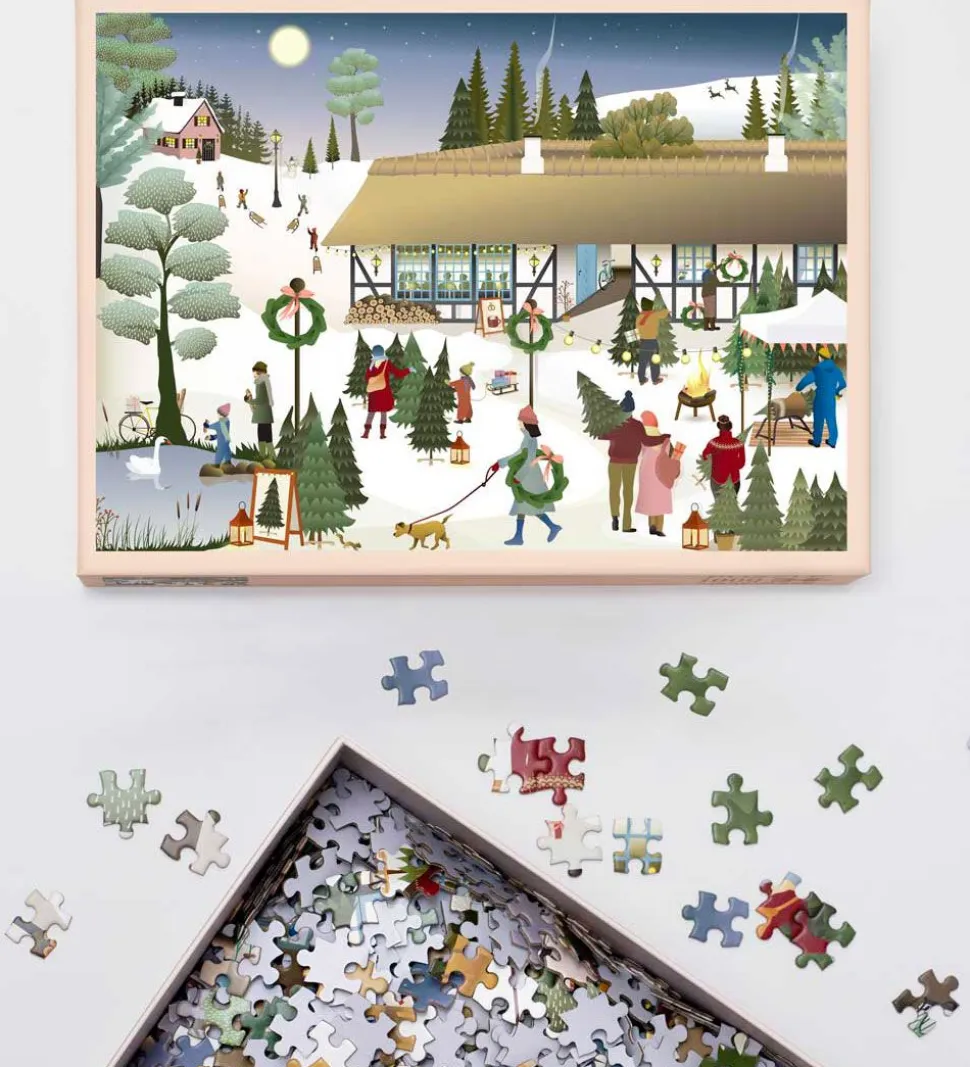 Smukt Vissevasse puslespil i rolige farver, som forestiller et snedækket landskab med en gård, hvor folk samles for at finde et juletræ til stuen.
