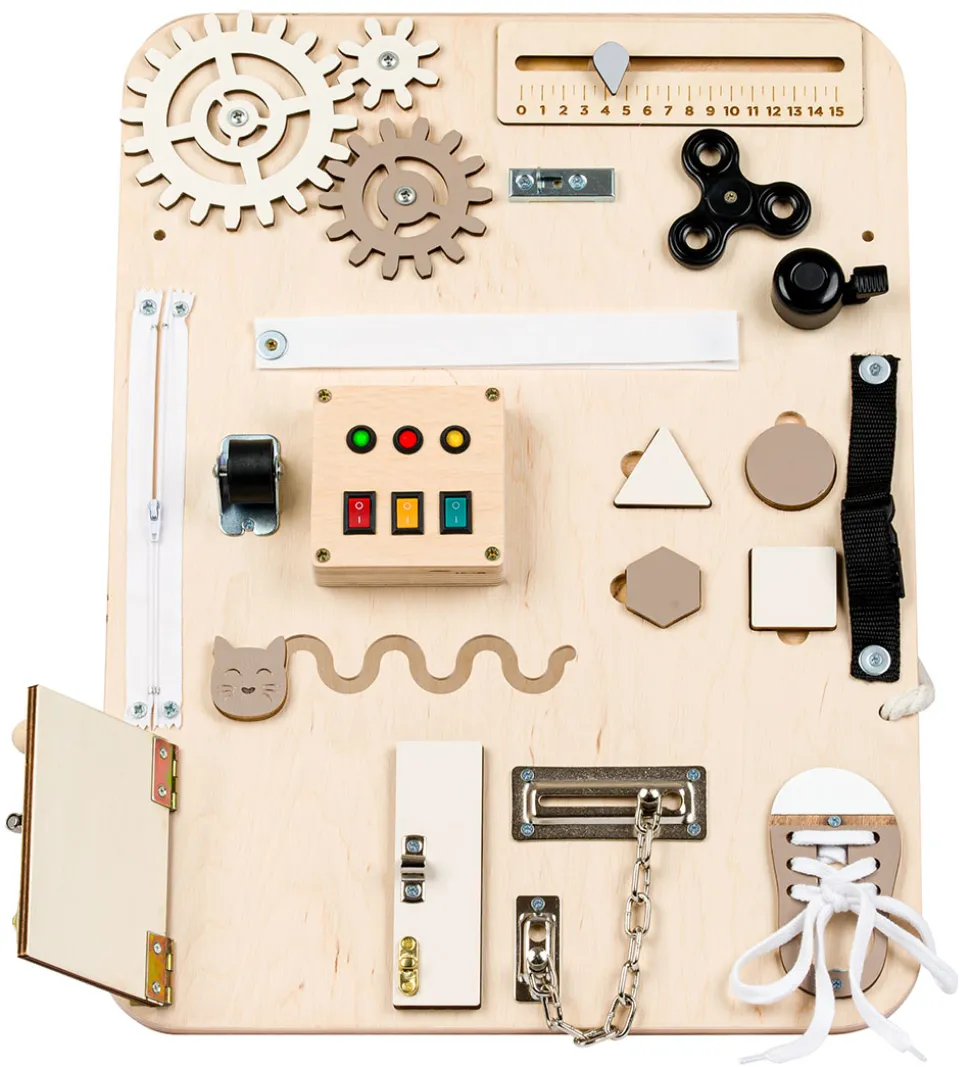 Woobiboo Woobiboardet er en aktivitetstavle, som kombinerer læring og leg. Den er designet til at vække barnets nysgerrighed og gennem leg styrke en række færdigheder. Woobiboardet styrker motorikken og logisk tænkning samt barnets uafhængighed, tålmodighed og psykomotoriske færdigheder. Woobiboardet rummer følgende aktiviteter: