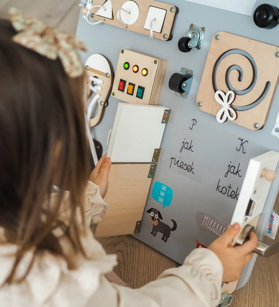 Woobiboo Woobiboardet er en aktivitetstavle, som kombinerer læring og leg. Den er designet til at vække barnets nysgerrighed og gennem leg styrke en række færdigheder. Woobiboardet styrker motorikken og logisk tænkning samt barnets uafhængighed, tålmodighed og psykomotoriske færdigheder. Woobiboardet rummer følgende aktiviteter: